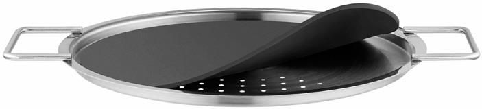 Eva Solo Pokrywka do odsączania 24 cm 203024 Eva trio Eva Solo Pokrywka do odsączania na garnek 24 cm Stalowa pokrywka do odsączania pasująca do wszystkich garnków Eva Trio (z kolekcji White Line, Stainless Steel, Dura Line, etc.) to pokrywka o płaskim kształcie i dwóch uchwytach. Cechą charakterystyczną tej pokrywy jest zintegrowane sitko z silikonową pokrywką, które pozwoli na odsączenie gotowanych w garnkach produktów Nie trzeba użyć dodatkowych sitek czy druszlaków W momencie odcedzania gotowanych składników, po przechyleniu garnka, część silikonowej pokrywki unosi się, pozwalając wodzie wypłynąć Można myć w zmywarce Średnica: 24 cm Marka: inna|Eva trio Stan: Nowy EAN: 5706631042369 Kod producenta: 203024
