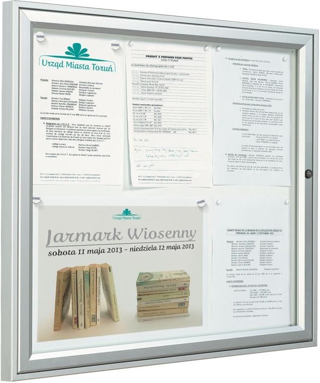 Gabloty zewnętrzne Classic to idealne gabloty ogłoszeniowe do umieszczania na fasadach budynków publicznych, urzędów. – gablota informacyjna zewnętrzna jednostronna, wykonana z największą dbałością o detale – rama z aluminium o grubości 58 mm – do montażu na ścianie lub na nogach ( nogi stanowią wyposażenie opcjonalne) – wykończenie anodowane srebrne, bez plastikowych narożników – do wyboru różne formaty gabloty mieszczące od 4 do 21 formatów A4 – drzwi otwierane na bok – wymienne i odwracalne bez konieczności zdejmowania gabloty; drzwi otwierane do góry przy szerokości gabloty 1330mm i 160mm – niewidoczne zawiasy, co dopełnia profesjonalny wygląd – oszklenie z tworzywa pleksi odpornego na uderzenia lub ze szkła bezpiecznego(opcja na specjalne zamówienie) o grubości 4mm – zamykana na zamek z kluczem – integralne zawiasy wewnątrz ramy, odporne na zużycie i zniszczenie – uszczelnienie z elastomeru z otworami zapobiegającymi kondensacji pary wodnej – spód z blachy cynkowanej polakierowanej na biało GABLOTY „CLASSIC” jednodrzwiowe zewnętrzne, przeszklenie z pleksi Ilość formatów A4 WYMIARY WAGA W KG GABLOTA JEDNODRZWIOWA 4x A4 Wys. 750 x 550 mm 9 GABLOTA JEDNODRZWIOWA 6x A4 Wys. 750 x 750 mm 11 GABLOTA JEDNODRZWIOWA 8x A4 Wys. 830 x 980 mm 18 GABLOTA JEDNODRZWIOWA 9x A4 Wys. 1050 x 750 mm 15 GABLOTA JEDNODRZWIOWA 12x A4 Wys. 1350 x 750 mm 19 GABLOTA JEDNODRZWIOWA 16x A4 Wys. 1350 x 1000 mm 26 GABLOTA JEDNODRZWIOWA DRZWI PODNOSZONE 18x A4 Wys. 1080 x 1330 mm 32 GABLOTA JEDNODRZWIOWA DRZWI PODNOSZONE 21x A4 Wys. 1130 x 1600 mm 41 – wyposażenie opcjonalne stanowią dwa słupki aluminiowe 60x40mm, których montaż odbywa się poprzez wbetonowanie bezpośrednio do podłoża (wysokość całkowita 2600mm), gabloty Classic z słupkami zobacz tutaj – opcje na zamówienie : przeszklenie ze szkła bezpiecznego 4mm, gabloty malowane w kolorach: bordowy, niebieski, zielony, brązowy; słupki do montażu poprzez przykręcenie na płycie mocującej (wysokość całkowita 2200 mm); tabliczki tytułowe, słupki do tabliczek tytułowych; zestaw oświetleniowy LED – o szczegóły zapytaj w naszym dziale handlowym.