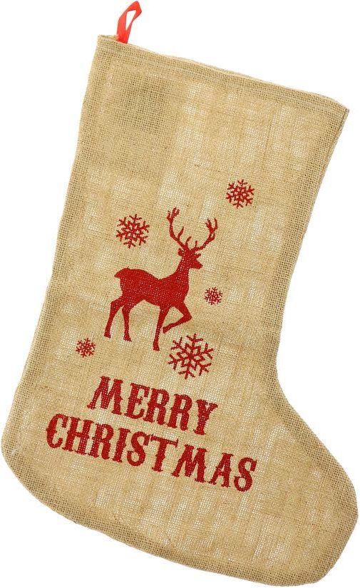 Skarpeta świąteczna na prezenty RENIFER juta Długość skarpety 44,5 cm. Szerokość skarpety 24,5 cm. Skarpeta zdobiona motywem renifera z dodatkiem śnieżynek. Dodatkowo posiada napis: "Merry Christmas". Wykonana z juty, z przeznaczeniem na drobiazg. Dodatkowo posiada praktyczną pętelkę do …