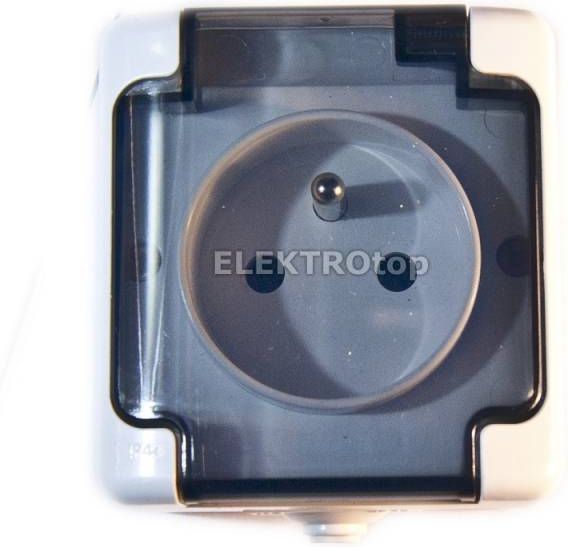 Gniazdo natynkowe pojedyncze z uziemieniem. Gniazdo hermetyczne (bryzgoszczelne) wyposażone w bolec. Napięcie znamionowe: 250V Prąd znamionowy: 16A Stopień ochrony: IP 44 Cechy: - nowatorskie szynoprzewody - mała kostka - zaciski gwintowe - szybki montaż przewodów - otwarcie klapki ponad 180 stopni - niezniszczalna sprężynka klapki - dymna klapka z poliwęglanu