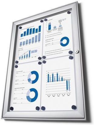 Gablota magnetyczna SCS Classic: Estetycznie wykonana gablota w profilu aluminiowym zamykana na zamek – powierzchnia suchościeralna magnetyczna: umożliwia pisanie markerami suchościeralnymi po powierzchni i mocowanie magnesów – głębokość wewnętrzna 13mm – grubość gabloty 23mm – do użytku wewnątrz pomieszczeń – możliwe stosowanie w miejscach osłoniętych na zewnątrz dzięki zastosowaniu uszczelki silikonowej wzdłuż wewnętrznego obwodu drzwi – zamykana za zamek – przedni panel akrylowy – zawiasy z boku – wymiary zewnętrzne gablot w tabeli poniżej Ilość formatów A4 i wymiar w mm, wysokość oznaczona (h) Gablota SCS 2xA4 wymiar 521×388(h) Gablota SCS 3xA4 wymiar 741×388(h) Gablota SCS 4xA4 wymiar 521×696(h) Gablota SCS 6xA4 wymiar 741×696(h) Gablota SCS 8xA4 wymiar 961×696(h) Gablota SCS 9xA4 wymiar 741×1004(h) Gablota SCS 12xA4 wymiar 961×1004(h)