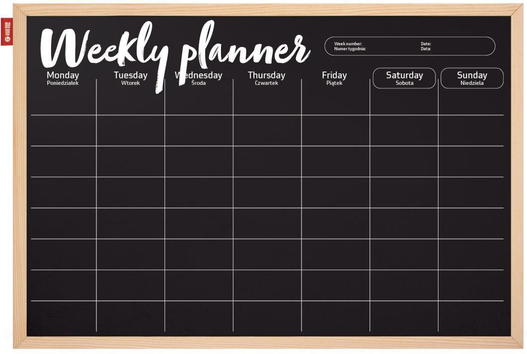 Tablica kredowa MEMOBE czarna 60x40 cm Wydawca: MEMOBE Planer tygodniowy MemoBe, kredowy • czarna powierzchnia z nadrukowanym w kolorze białym harmonogramem umożliwiającym planowanie zadań tygodniowych • powierzchnia wykonana z wysokiej jakości paneli drewnopochodnych pokrytych matowym lakierem w kolorze czarnym • optymalny poziom szorstkości zapewnia komfortowe pisanie kredą lub markerami kredowymi • rama wykonana z naturalnego, surowego drewna sosnowego • tablica jest nośnikiem informacji oraz świetnym planistą i organizatorem codziennych zajęć dla dzieci, młodzieży i dorosłych; pozwala uporządkować notatki, zaprezentować ważne informacje • doskonale sprawdzi się zarówno w domu jak i w restauracji, sklepie i w innych punktach usługowych [Stamp,5903273082085,2/23/2024 11:30:33 AM]