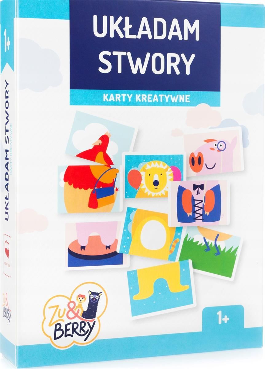 Karty kreatywne „Zu & Berry” wspierają przede wszystkim wyobraźnię dziecka. W tym zestawie znajdziecie 36 dwustronnych, grubych kart z podziałem rozmaitych stworów na trzy części. Dziecko tworzy własne postaci, dopasowuje elementy według schematu – wygląd stwora oraz tło, rozpoznaje zwierzęta, kolory, części ciała lub garderoby, a także emocje, które odzwierciedlają minki i oczy naszych bohaterów. „Układam stwory” przeznaczone jest dla dzieci w wieku już od 1 roku życia. Ułożyć możemy 24 bajkowe obrazki – realne zwierzęta, którym nadano cechy ludzkie – wyprostowaną postawę ciała, buzie, trzymanie obiektów typowo dziecięcych – zabawki. więcej i filmy: