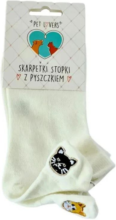 - białe, gładkie skarpetki stopki - rozmiar uniwersalny - nad piętą wyszyte pyszczki: na jednej ze skarpetek pieska, na drugiej kotka