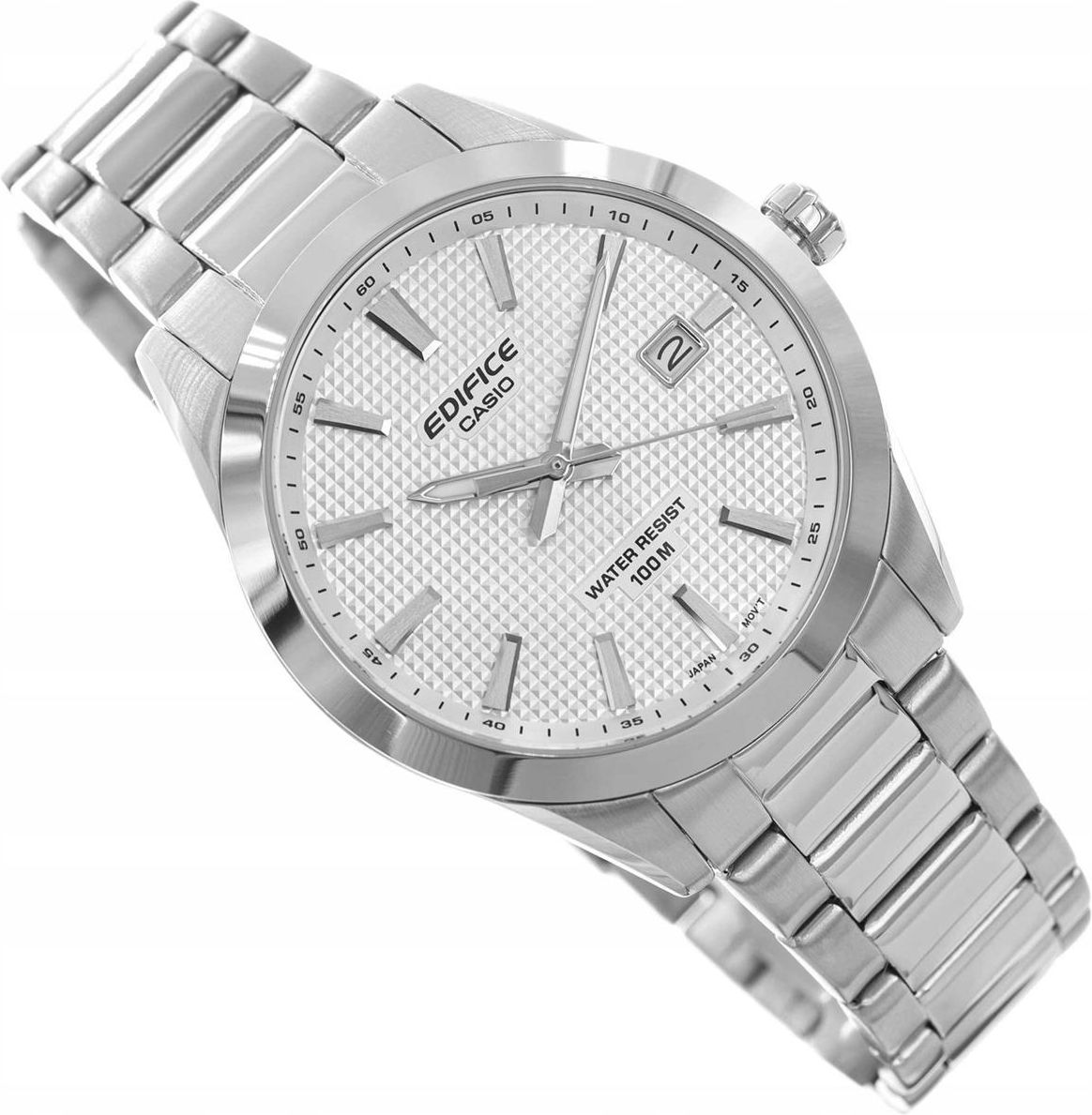 MĘSKI ZEGAREK CASIO EFV-160D-7AVEF EDIFICE SREBRNY NA BRANSOLECIE DATOWNIK Seria Edifice oferuje zegarki, które łączą w sobie stylową elegancję z dynamicznym charakterem sportowych czasomierzy, tak jak model EFV-160D-7AVEF Fabrycznie nowy, oryginalny Casio Edifice EFV-160D-7AVEF wyróżnia się srebrną tarczą zestawioną z kopertą i bransoletą ze stali szlachetnej, tworząc harmonijną, elegancką całość. Mineralne szkło, mechanizm kwarcowy z datownikiem oraz powłoka neobrite zapewniają trwałość i funkcjonalność, a wodoszczelność do 100 metrów i solidne zapięcie motylkowe czynią go niezawodnym towarzyszem zarówno na co dzień, jak i w formalnych stylizacjach. Specyfikacja zegarka Mechanizm: kwarcowy - zasilany baterią. Datownik: wskaźnik dnia miesiąca. Koperta: wykonana ze stali szlachetnej wysokiej jakości, która charakteryzuje się najwyższym stopniem odporności na korozję. Szkiełko: szkiełko szafirowe- wysokiej jakości, które jest odporne na zarysowania - płaskie. Bransoleta: wykonana ze stali szlachetnej wysokiej jakości, która charakteryzuje się najwyższym stopniem odporności na korozję. Wodoszczelność: klasa wodoszczelności - 100M. Można pływać, ale nie wolno wciskać przycisków pod wodą. Neobrite: fosforyzowane wskazówki świecące w ciemności. Dekielek: zakręcany Kolorystyka koperta: srebrna tarcza: srebrna bransoleta: srebrna wskazówki: srebrno-białe Tuż przy indeksie oznaczającym godzinę trzecią znajduje się okienko datownika, wskazującego dzień miesiąca. Wskazówki zostały wyposażone w elementy z fosforyzującą powłoka neobrite, która po naświetleniu świeci przez jakiś czas ułatwiając odczyt wskazań zegarka. Klasa wodoszczelności 10BAR pozwala na pływanie z zegarkiem na ręce. Wykonana z wysokiej jakości stali szlachetnej koperta w kolorze srebrnym doskonale komponuje się z bransoletą wykonaną z tego samego materiału. Cyferblat zabezpiecza płaskie szkiełko mineralne. Wymiary koperta : szerokość 40mm, wysokość 47mm tarcza : średnica 33mm szerokość bransolety: 20mm grubość zegarka: 10mm obwód zegarka do 20cm (możliwość skrócenia) waga: 110g W zamówieniu otrzymasz fabrycznie nowy i oryginalny zegarek kartę gwarancyjną wraz z potwierdzeniem zamówienia książeczkę od producenta (jeżeli takową producent załączył) oryginalne pudełko - zegarek zapakowany jest w oryginalne opakowanie, które nadaje się na prezent.