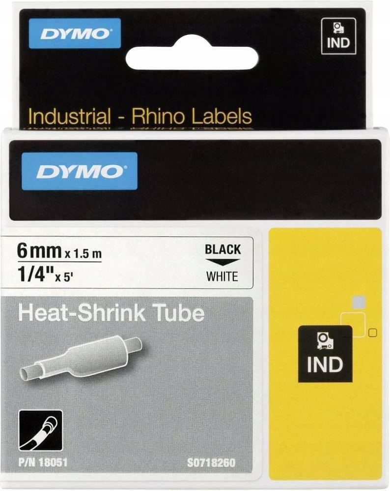 Taśma do nadruku rurek termokurczliwych DYMO RHINO DYMO S0718260, 6 mm x 1.5 m, Kolor taśmy: biały / Kolor nadruku: czarny Taśma do nadruku węży termokurczliwych DYMO RHINO Na etykiety Rhino można liczyć nawet w trudnych warunkach. Są odporne na różne warunki pogodowe i wytrzymałe, łatwo dają się zmywać, mocować oraz nakładać. Termokurczliwe taśmy do nadruku z poliolefiny marki DYMO pozwalają na czyste i trwałe oznakowanie kabli o różnych średnicach. Cechy szczególne Czyste i trwałe oznakowanie Wąż termokurczliwy 6 mm x 1,5 m Średnica kabla: 1,18 - 2,33 mm Charakterystyka Termokurczliwa taśma do nadruku
