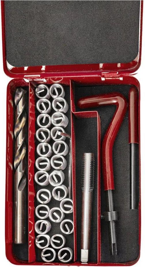 Zestaw do naprawy gwintów w blaszanym pudełku.Ten zestaw do naprawy gwintów marki Meec Tools zawiera gwintowniki, narzędzie montażowe i wkładki – wszystko, czego potrzebujesz do wymiany uszkodzonego gwintu na nową wkładkę gwintową. Narzędzie i wiertła są wykonane ze stali HSS, a wkładki ze stali nierdzewnej 304. Wszystkie elementy są dostarczane w poręcznym blaszanym pudełku. Liczba wkładek: 25 szt.
