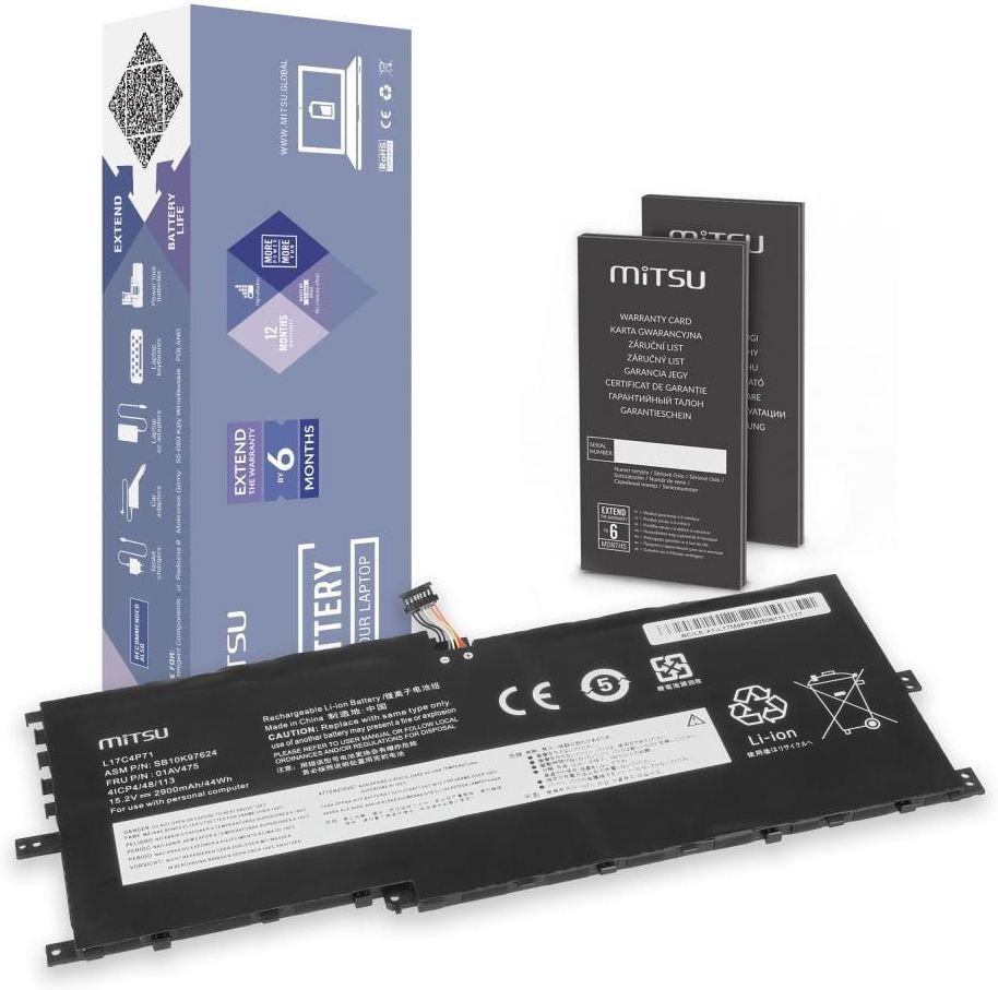 Bateria L17C4P71 do Lenovo ThinkPad X1 Yoga Gen 3, Yoga 2018 Akumulator / bateria Mitsu do laptopa to sprawdzone ogniwa i najwyższej jakości elektronika. Dzięki temu bateria współpracuje z laptopem dokładnie tak jak oryginalny akumulator! NAJWAŻNIEJSZE ZALETY wysokogatunkowe ogniwa litowo-polimerowa bez efektu pamięci faktyczna deklarowana pojemność znacznie wolniejszy spadek nominalnej pojemności w porównaniu do innych, tańszych zamienników wbudowany inteligentny układ bezpieczeństwa, chroniący przed przepięciem, przegrzaniem, zwarciem, przeciążeniem prądowym, głębokim rozładowaniem i przeładowaniem niska podatność na samoistne rozładowania. To sprawia, że możemy dać Ci gwarancję utrzymania ponad 80% pojemności akumulatora po roku używania Twój laptop będzie bezpiecznie i stabilnie pracować na tej baterii przez wiele godzin Swoim perfekcyjnym wykonaniem idealnie dopasowuje się do komputera przenośnego PARAMETRY TECHNICZNE Producent: Mitsu Pojemność: 2900 mAh (44 Wh) Napięcie: 15.2V Rodzaj ogniw: litowo-polimerowa Ilość ogniw: 3 ogniwa Li-polymer Certyfikat: CE, RoHS W zestawie: bateria, instrukcja obsługi, karta gwarancyjna Czas pracy: taki sam jak dla fabrycznej baterii o tej samej pojemności Jak dobrać odpowiednią baterię? Wyszukiwać można po modelu komputera lub baterii. Model laptopa najczęściej podany jest na spodzie urządzenia. Oznaczenie i parametry baterii zawsze znajdują się na samym akumulatorze. Wyjmij baterię z laptopa i sprawdź naklejkę producenta. Indywidualny kod baterii z reguły podany jest obok informacji o kraju produkcji, napięciu i pojemności baterii.
