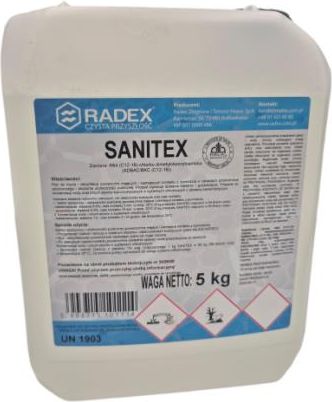Płyn do mycia i dezynfekcji powierzchni kontaktujących się z żywnością w zakładach przetwórstwa spożywczego SANITEX RADEX - Płyn do mycia i dezynfekcji powierzchni kontaktujących się z żywnością w zakładach przetwórstwa spożywczego. SANITEX jest pianowym produktem myjąco-dezynfekującym o lekkim odczynie zasadowym, przeznaczonym do zastosowania w zakładach przemysłu spożywczego i obszarze użyteczności publicznej, oraz konserwacji wody i płynów w systemach chłodniczych. Jako substancję czynną zawiera: alkil (C12-16)-chlorku dimetylobenzyloamonu (ADBAC/BKC (C12-16)): CAS: 68424-85-1, WE: 270-325-2 [zaw. 5g/100g]. Opakowanie: 5 kg. Zalecane stężenia roztworów roboczych, ich właściwości biobójcze oraz czas kontaktu: 1. Sektor spożywczy i użyteczności publicznej (powierzchnie mające i niemające kontaktu z żywnością): bakteriobójcze: stężenie 6,0%, czas kontaktu 5 min. w temp. 20°C (6kg preparatu SANITEX rozpuścić w 94 litrach (kg) wody). grzybobójcze: stężenie 5,0%, czas kontaktu 15 min. w temp. 20°C (5kg preparatu SANITEX rozpuścić w 95 litrach (kg) wody). 2. Konserwacja wody i innych płynów w systemach chłodniczych: bakteriobójcze - stężenie 1%: czas kontaktu 3 i 24 godzin, dla temperatury 25°C. SANITEX RADEX - Płyn do mycia i dezynfekcji powierzchni kontaktujących się z żywnością w zakładach przetwórstwa spożywczego. ZASTOSOWANIE Mycie i dezynfekcja powierzchni mających i niemający kontaktu z żywnością m.in: ścian, posadzek, maszyn, urządzeń; Mycie i dezynfekcja aparatów, urządzeń i powierzchni produkcyjnych metodą pianową; Mycie i dezynfekcja aparatów, urządzeń i powierzchni produkcyjnych metodą ręczną; Mycie i dezynfekcja powierzchni wykonanych z metali i tworzywa sztucznego; Preparat do konserwacji wody i innych płynów wykorzystywanych w systemach chłodniczych.