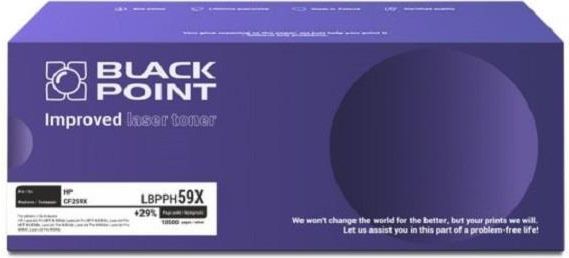 Toner marki Black Point LBPPH59XC ( zamiennik HP CF259X ) do drukarek: HP: LaserJet Pro: MFP M428dw, M428fdn, M428fdw, M404dn, M404dw, M404n HP LaserJet Enterprise M406dn Wydajność: 10.500 stron przy 5% pokryciu UWAGA!!! Toner z chipem od razu gotowy do pracy - nie potrzeba przekładać chipa z oryginalnego tonera! Chip w wersji NEW - pokazuje stan materiału eksploatacyjnego. Producent (Black Point S.A.) zapewnia bezpłatną aktualizację oprogramowania chipa w przypadku aktualizacji oprogramowania drukarki. Tonery Black Point zapewniają: ponad 30% oszczędności kosztów druku w porównaniu do tonerów producentów sprzętu, stabilność parametrów wyznaczonych w oparciu o normy, np. ISO/IEC 19752:2004, wysoką jakość i niezawodność potwierdzają także niezależne jednostki badawcze – CHIP LB oraz amerykański Instytut RIT pełne bezpieczeństwo użytkowania dzięki dożywotniej gwarancji na produkt oraz dodatkowej gwarancji na drukarkę. Wysoką jakość, wydajność oraz pełne bezpieczeństwo osiągnięto dzięki odpowiedniej technologii produkcji i wysokiej jakości komponentów. Pomiar wydajności odbywa się zgodnie z wytycznymi norm ISO 19752:2004 oraz ASTM. Dlaczego warto wybrać produkty Black Point - Firma produkująca markę Black Point obecna jest na rynku od 20 lat - Posiada certyfikaty jakości ISO 9001 od 2002 roku oraz certyfikat ISO 14001 od 2006r - Tonery marki Black Point testowane ze standardem pomiaru wydajności ISO 19752, czyli takim samym, jak produkty producentów drukarek - Produkowane są z wykorzystaniem nowoczesnych urządzeń oraz wysokiej jakości nowych komponentów - Wysoka jakość wydruków potwierdzona jest referencjami od wielu zadowolonych użytkowników - Pełne bezpieczeństwo użytkowania gwarantuje dożywotnia gwarancja na produkt oraz drukarkę oraz serwis „door to door Gwarancja na produkty Black Point oraz na Państwa drukarkę Gwarancja na produkty marki Black Point jest dożywotnia, dlatego na opakowaniu nie ma daty określającej termin przydatności. Producent zapewnia niezawodność produktów Black Point przez cały okres ich eksploatacji, tj. do momentu wyczerpania ładunku barwiącego (atramentu, toneru itd.). Stosowanie produktów Black Point nie narusza gwarancji prawnych producenta drukarki. Black Point zapewnia naprawę lub wymianę urządzenia na własny koszt, jeżeli jego uszkodzenie zostanie spowodowane bezpośrednio przez użycie produktu Black Point. Program „Satysfakcji Gwarantowanej Producent Black Pointa gwarantuje, że w przypadku braku satysfakcji z użytkowania produktów Black Point, przekaże do użytkownika nowy produkt. SERWIS GWARANCYJNY „ door to door czyli „za trzy dni w domu wymiana na nowy produkt"Aby skorzystać z serwisu produkt należy skorzystać z "POMOCY SERWISOWEJ" umieszczonej na stronie internetowej www.blackpoint.pl Bezpłatna infolinia techniczna Użytkownicy produktów Black Point mają dostęp do fachowej wiedzy ekspertów od drukowania dzięki bezpłatnej infolinii Black Point tel. 0800 166 054