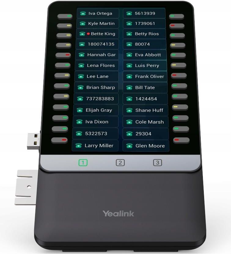 YEALINK EXP55 - Konsola sekretarska do serii T7X oraz T8X Yealink Specyfikacje – Yealink EXP55 Wyświetlacz 5,5" kolorowy ekran LCD, rozdzielczość 480 × 960 px, z podświetleniem Możliwość wyświetlenia trzech stron Różne kolorowe ikony przypisane do funkcji Przyciski i wskaźniki 26 fizycznych klawiszy, każdy z dwukolorową diodą LED Do 52 dodatkowych klawiszy dzięki przełączaniu stron 3 niezależne klawisze sterujące z podświetleniem LED do szybkiego przełączania stron Programowalne funkcje: linia współdzielona, BLF, parkowanie połączeń, konferencja, przekierowanie, grupowe odbieranie, grupowe nasłuchiwanie, LDAP, przeglądarka XML i inne Funkcje dodatkowe Tapeta, wygaszacz ekranu, tryb oszczędzania energii Podstawka z 2 regulowanymi kątami nachylenia Obsługa do 3 modułów EXP55 podłączonych do telefonu IP serii T7X/T8X Wymagany zewnętrzny zasilacz Yealink (5 V / 2 A) przy podłączeniu dwóch lub trzech modułów Port USB (2.0) do przesyłu danych Port USB (2.0) do: przewodowych/bezprzewodowych zestawów słuchawkowych USB Wi-Fi poprzez adapter WF40/WF50 nagrywania rozmów na pamięć USB Maksymalne zużycie energii (PSU): 1,5 W Wymiary: 124 × 137,5 × 42,6 mm Zakres temperatur pracy: –10 do +50 °C Zakres temperatur przechowywania: –30 do +70 °C Wilgotność pracy: 10–95% Zawartość opakowania Moduł Yealink EXP55 Color Expansion Module Podstawka Śrubokręt Śruby montażowe Instrukcja szybkiego uruchomienia Yealink EXP55 Moduł rozszerzeń Yealink EXP55 dla telefonów IP Yealink serii T7X/T8X został zaprojektowany, aby znacząco zwiększyć funkcjonalność Twojego telefonu SIP. Wyposażony w duży ekran LCD o przekątnej 5,5 cala w kolorze, zapewnia żywe i czytelne wrażenia wizualne. Oferuje prosty interfejs użytkownika oraz zaawansowane możliwości obsługi połączeń. Na wyświetlaczu dostępne są trzy strony po 26 programowalnych przycisków, co daje łącznie do 78 funkcji, które można skonfigurować zgodnie z potrzebami. Przypisane klawisze mogą pełnić rolę BLF, szybkiego wybierania, przekierowania połączeń, transferu, parkowania czy odbierania rozmów. EXP55 to idealne rozwiązanie dla recepcjonistów, asystentów administracyjnych oraz pracowników call center – umożliwia łatwe monitorowanie kontaktów i obsługę dużej liczby połączeń.
