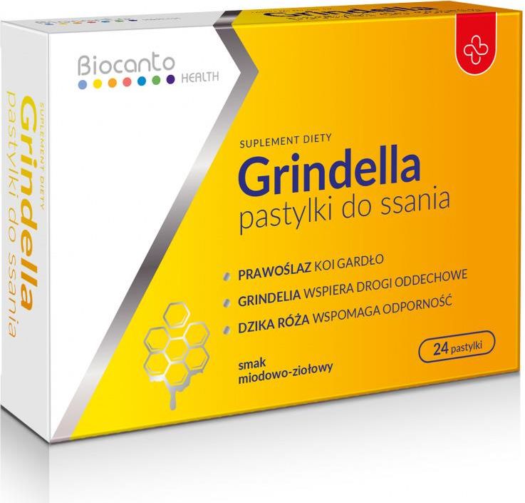 Biocanto Grindella 24 pastylki to suplement diety w postaci pastylek do ssania, bogaty w naturalne ekstrakty i mód. Obecny w produkcie ekstrakt z korzenia prawoślazu przynosi ukojenie jamy ustnej i gardła oraz wspiera zdrowie dróg oddechowych, grindelia wpływa korzystnie na gardło, a owoc dzikiej róży pomaga wzmocnić odporność organizmu, będąc naturalnym źródłem witaminy C. Grindella pastylki ziołowe do ssania są wygodne w użyciu, dodatkowo posiadają miodowo-ziołowy smak. Biocanto Grindella 24 pastylki to propozycja dla osób dorosłych.
