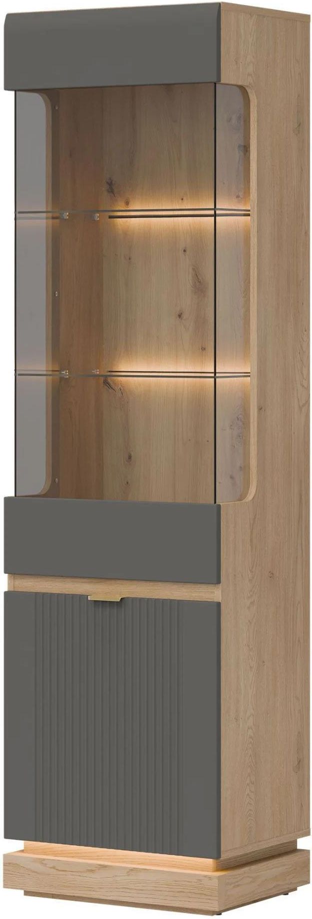 Witryna wąska Przeszklona szafka do salonu Dąb Cremona Szary MILTON ML05 MILTON ML05 Wysoka witryna L/P ML05 pochodząca z kolekcji Milton stworzona z myślą o Minimalistycznyj aranżacji jadalni, kuchni, salonu czy pokoju dziennego, która zachwyci wyjątkowym stylem, funkcjonalnością i wygodą …