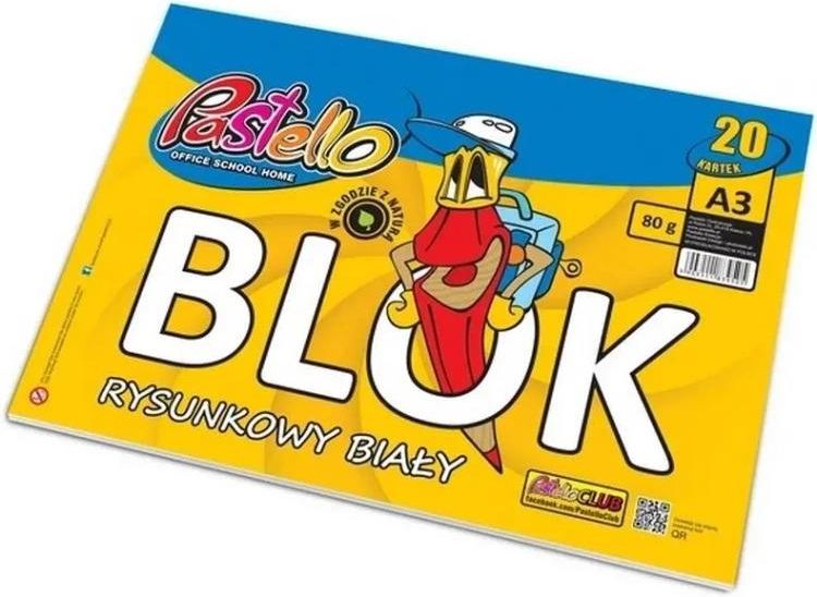 Blok rysunkowy BIAŁY, format A3, 20 kartek, gramatura 80 gram. Doskonały do rysowania kredkami, ołówkiem, malowania i innych prac manualnych. Papier odporny na wymazywanie gumką. EAN: 5903111839505