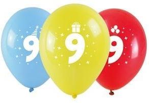 Balony z nadrukiem 9 28cm 3szt ARPEX __________________________________________________________________ Balony kolorowe wykonane z naturalnego lateksu z obustronnym nadrukiem cyfry. Nadruk wykonany w kolorze białym, kolory balonów: czerwony, żółty i niebieski. W zależności od koloru balonu …
