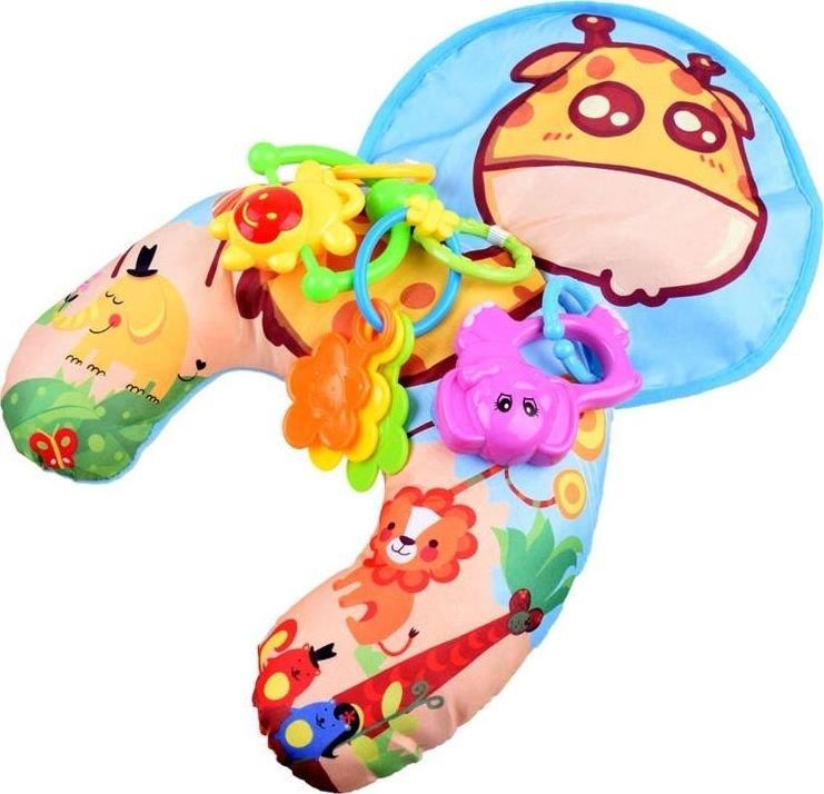 Poduszka stabilizacyjna sprawdzi się podczas opieki nad maleństwem. Poduszka w rewelacyjnej grafice z szeleszczącą podkładką i kolorowymi grzechotkami zapewni wiele wesołej zabawy każdemu maluszkowi. Poduszka stabilizacyjna może być używa na 2 sposoby: - wałeczek- pod brzuszek - dziecko leżące na brzuszku - ma pod sobą wałek i przed sobą wesołe zabawki, dzięki czemu ćwiczy mięśnie pleców i świetnie się bawi. - podusia także sprawdzi się u starszych dzieci podczas podróży jako wałek pod kark Poduszka może być wykorzystana także jako stabilizator w foteliku samochodowym. Można jej używać w domu oraz na spacerze- w gondoli wózka. Zestaw zawiera: - podusia z szeleszczącą mini matą - kolorowe grzechotki Wymiar poduszki: - 38 x 26 x 10cm - mata 28 x 18cm Zabawa na macie stymuluje zmysł wzroku, słuchu i dotyku. Żywe kolory zwrócą uwagę Maluszka i wspomogą zdolność rozróżniania kształtów i barw. Grzechotki pozytywnie wpłyną na rozwój słuchu i koordynację rączek- można pozwolić dziecku swobodnie nimi się bawić lub dopiąć do miękkiego wałka. Poduszka sprawdzi się w różnych sytuacjach- podczas zabaw w pokoju, przed i po kąpieli, można ją też zabrać na wycieczkę do parku i pozwolić Smykowi na brykanie na niej:). Łatwo ją złożyć, przechowywać czy przewozić, jest łatwa w utrzymaniu czystości. Podusia zapakowana jest w ładne kolorowe pudełko, idealne na prezent.