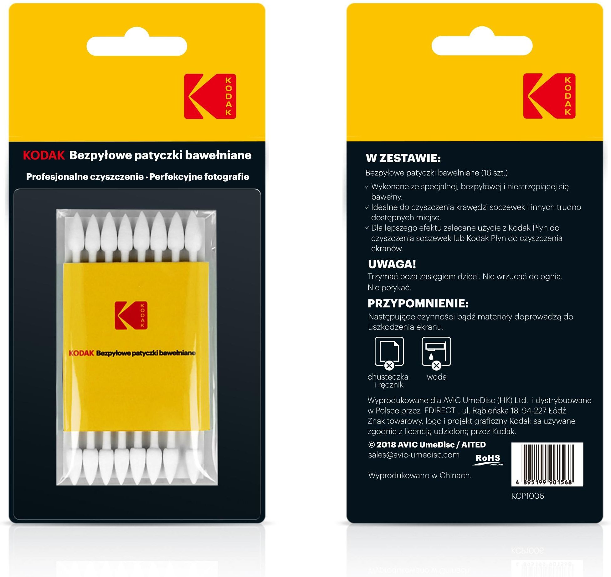 Kodak bawełniane patyczki do optyki 16 szt Kodak Patyczki bawełniane Kodak znajdą zastosowanie przy czyszczeniu wszelkich trudno dostępnych miejsc w aparatach, kamerach i innych urządzeniach elektronicznych. Wykonane zostały ze specjalnej, bezpyłowej i niestrzępiącej się bawełny. Idealnie sprawdzą się przy czyszczeniu krawędzi soczewek i trudno dostępnych miejsc. Dla najlepszego efektu zalecane jest użycie z płynami do czyszczenia firmy Kodak. Wieloletnie doświadczenie Właściciel marki Kodak, Eastman Kodak Company, to jeden z największych na świecie koncernów zajmujących się produkcją sprzętu fotograficznego i filmowego. Kilkadziesiąt lat doświadczenia gwarantuje wysoką jakość i niezawodność. Zawartość zestawu Bezpyłowe patyczki bawełniane x 16 szt.