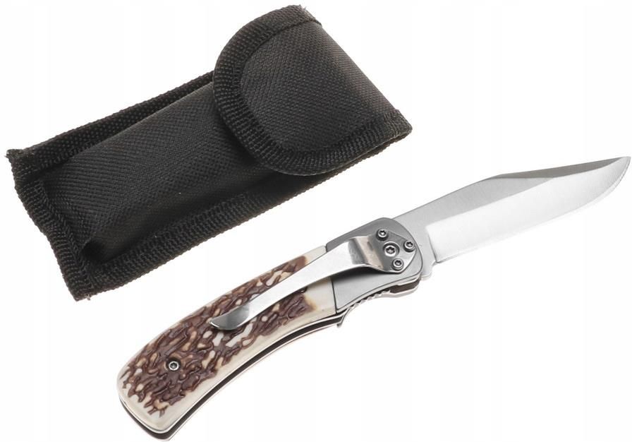 Nóż składany z pokrowcem Głownia typu Clip point charakteryzuje się dobrą przebijalnością oraz dobrze sprawdza się przy precyzyjnych zadaniach Cechy produktu: Nóż wykonany z wysokiej jakości stali Stalowy uchwyt z nakładkami z tworzywa na wzór kości Klips umożliwia zapięcie na pasek Rękojeść typu Frame lock Bardzo ostry Wygodnie leży w dłoni Scyzoryk składany Bardzo solidne wykonanie Długość ostrza: 7,5 cm Długość noża: 18 cm Długość noża złożonego: 10 cm W zestawie futerał