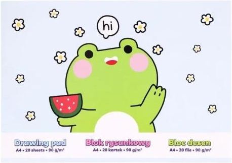 Blok rysunkowy A4 20 kartek, 90 g/m2 Urocza żabkaPoręczny format A4, idealny dla młodych artystów.Papier 90 g/m2 do rysunku ołówkiem, kredkami i delikatnych technik mokrych.Klejony u góry, łatwe i estetyczne odrywanie kartek.