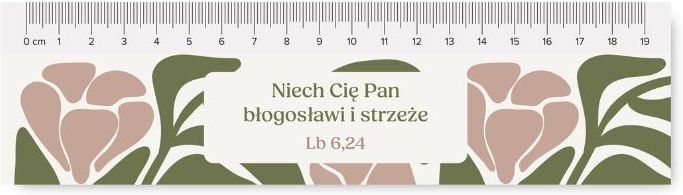 Linijka papierowa – Niech Cię Pan błogosławi i strzeże Wykonana z trwałego papieru kredowego, idealnie sprawdzi się w codziennym użytkowaniu przez dzieci i dorosłych, zarówno w szkole, jak i w biurze. Ta linijka to nie tylko praktyczne narzędzie, ale również piękny symbol chrześcijańskiej wiary. Doskonała dla każdego, kto chce pobłogosławić swojego przyjaciela czy bliskiego dobrym słowem każdego dnia. Idealna do użytku szkolnego, biurowego, a także jako wyjątkowy prezent dla bliskiej osoby. Wymiary: 20 x 5 cm – praktyczny rozmiar do piórnika czy na biurko; Materiał: Papier kredowy mat 350 g, który zapewnia wytrzymałość; Skala: Precyzyjna skala centymetrowa do 19 cm, idealna do nauki i pracy; Design: Nowoczesny motyw kwiatowy oraz tekst z Księgi Liczb 6,24 „Niech Cię Pan błogosławi i strzeże”, który przypomina o tym, że Bóg zawsze jest po naszej stronie i chce nam błogosławić.