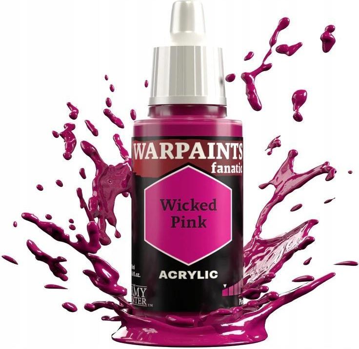 Farba The Army Painter Warpaints Fanatic - Wicked Pink Warpaints Fanatic to nowa seria farb firmy The Army Painter. Cechuje się wysokim napigmentowaniem, dobrym kryciem oraz szeroką gamą kolorów. Sześciokolorowy system triad kolorów pomaga dobrać wymagany odcień farby. Każda z farb została wyposażona w stalowe kulki ułatwiające mieszanie przed użyciem oraz znany z farb The Army Painter kroplowy system dozowania. Buteleczka z zakraplaczem ma pojemność 18 ml.
