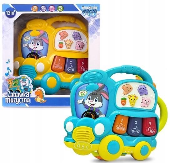 Funkcje: 3 tryby muzyczne: 4 zabawne dźwięki, 4 melodie, odgłosy zwierząt odgłosy: kotka, pieska, małpki, królika, słonia, owcy, lwa 3-stopniowa skala c-dur 2 poziomy głośności podświetlany listek 2 kolory: żółty, niebieski Pozostałe informacje: wym. opakowania: 17,5 x 18,5 x 5,5 cm. baterie: 2 x AA 1,5V brak w zestawie wiek: 12M+ EAN: 5901811170676