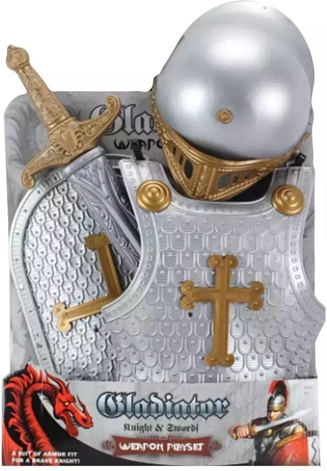 Zestaw rycerski składa się z zbroi, tarczy, miecza i hełmu.