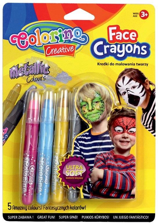 COLORINO - Kredki do malowania twarzy 5 szt. na blistrze / Metallic Metaliczne kredki do twarzy - błyszczące efekty na każdą okazję Kredki do malowania twarzy COLORINO w metalicznych odcieniach to świetny sposób na wyjątkową charakteryzację. Dzięki kremowej formule łatwo się aplikują, a ich lśniące kolory sprawdzą się podczas festiwali, urodzin, zabaw karnawałowych czy występów scenicznych. Są bezpieczne dla skóry i łatwe do zmycia wodą z mydłem. Cechy produktu 5 metalicznych kolorów, zapewniających efektowny połysk Miękka i kremowa konsystencja, ułatwiająca aplikację Bezpieczne dla skóry, odpowiednie dla dzieci Łatwe do zmycia, wystarczy woda i mydło Opakowanie: Blister - 5 sztuk kredek Idealne do tworzenia oryginalnych stylizacji i wyjątkowych efektów!