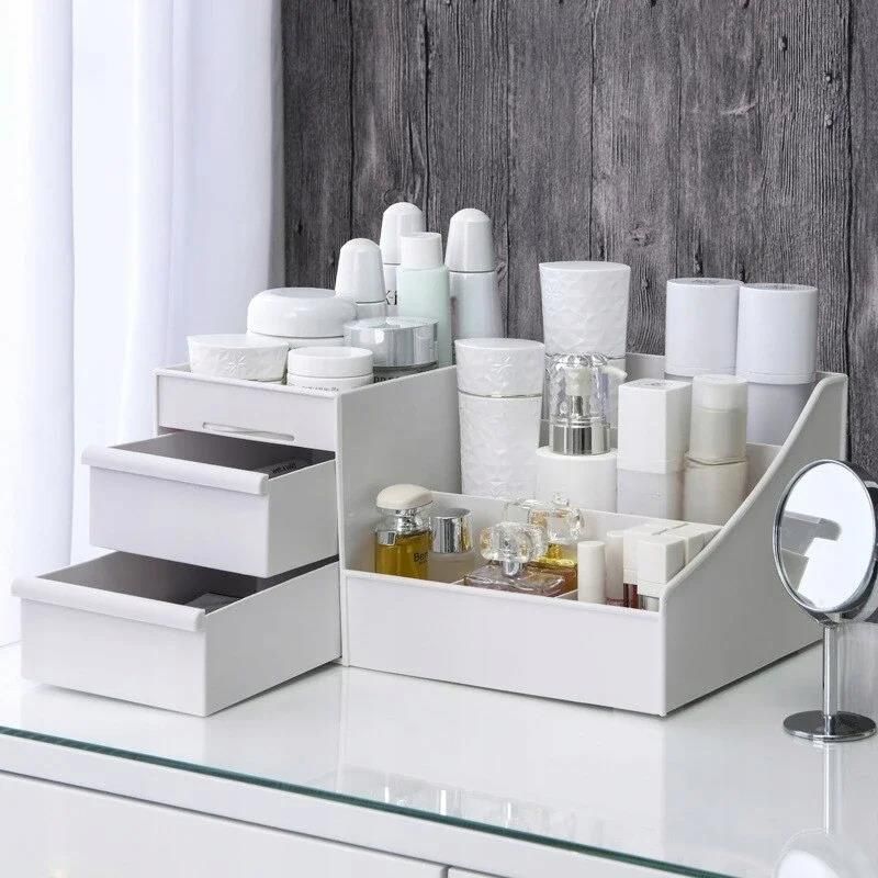 DWIE POJEMNE SZUFLADY Każda szuflada oferuje wystarczająco dużo miejsca do przechowywania różnorodnych kosmetyków i akcesoriów. Są idealne do układania większych przedmiotów, takich jak palety cieni, pudry, czy opakowania produktów do pielęgnacji skóry. Dlaczego warto wybrać nasz organizer? Wielofunkcyjny i praktyczny Pomaga zachować porządek Uniwersalny biały kolor Duży i pojemny Idealny do kosmetyków i nie tylko Specyfikacja Kolor: biały Materiał: tworzywo sztuczne Długość: 26,5 cm Szerokość: 16 cm Wysokość: 12 cm Organizer ma przegródki i szufladki w różnych rozmiarach, idealne do przechowywania kosmetyków o różnych wielkościach – od drobnych akcesoriów, takich jak klipsy i spinki do włosów, po większe przedmioty, jak palety cieni i flakony perfum.