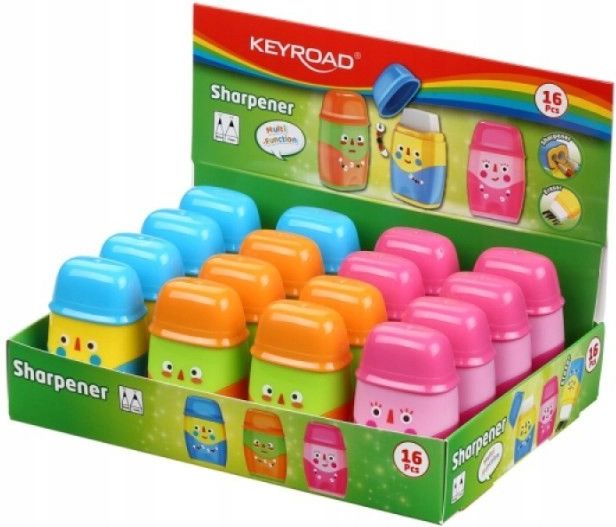 TEMPERÓWKA PODWÓJNA Z GUMKĄ KEYROAD HELLO RÓŻNE KOLORY DO WYBORU Produkt w różnych wersjach. Cena dotyczy jednego produktu. W wiadomości do sprzedającego można zasugerować wzór/kolor, jednak w razie braku wybranego wariantu wysyłamy towar w zależności od dostępności na magazynie!!!!! Temperówka Keyroad 2 w 1 z gumką Posiada dwa otwory na ołówki/kredki o średnicy 8 i 11 mm Z pojemnikiem na strużki.
