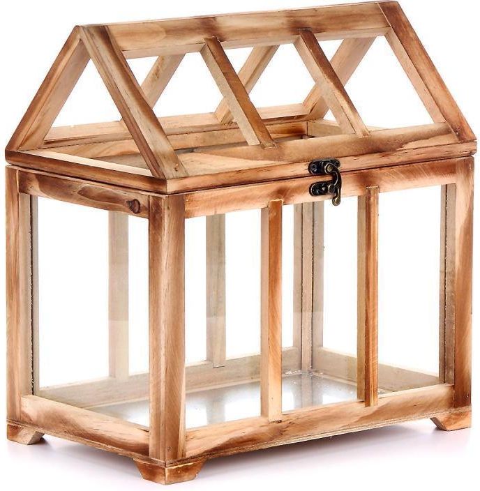 - mała, drewniana szklarnia - konstrukcja w kształcie domku ze spadzistym dachem - górna część otwarta, bez szybek - dolna część posiada przeszklone ścianki - daszek na zawiasach, możliwość otwierania i zamykania na haczyk - metalowa płytka na dnie w środku - umieszczona na niskich nóżkach - materiał: drewno, szkło, żelazo - wymiary (wysokość x szerokość x głębokość): 30x28x18 cm