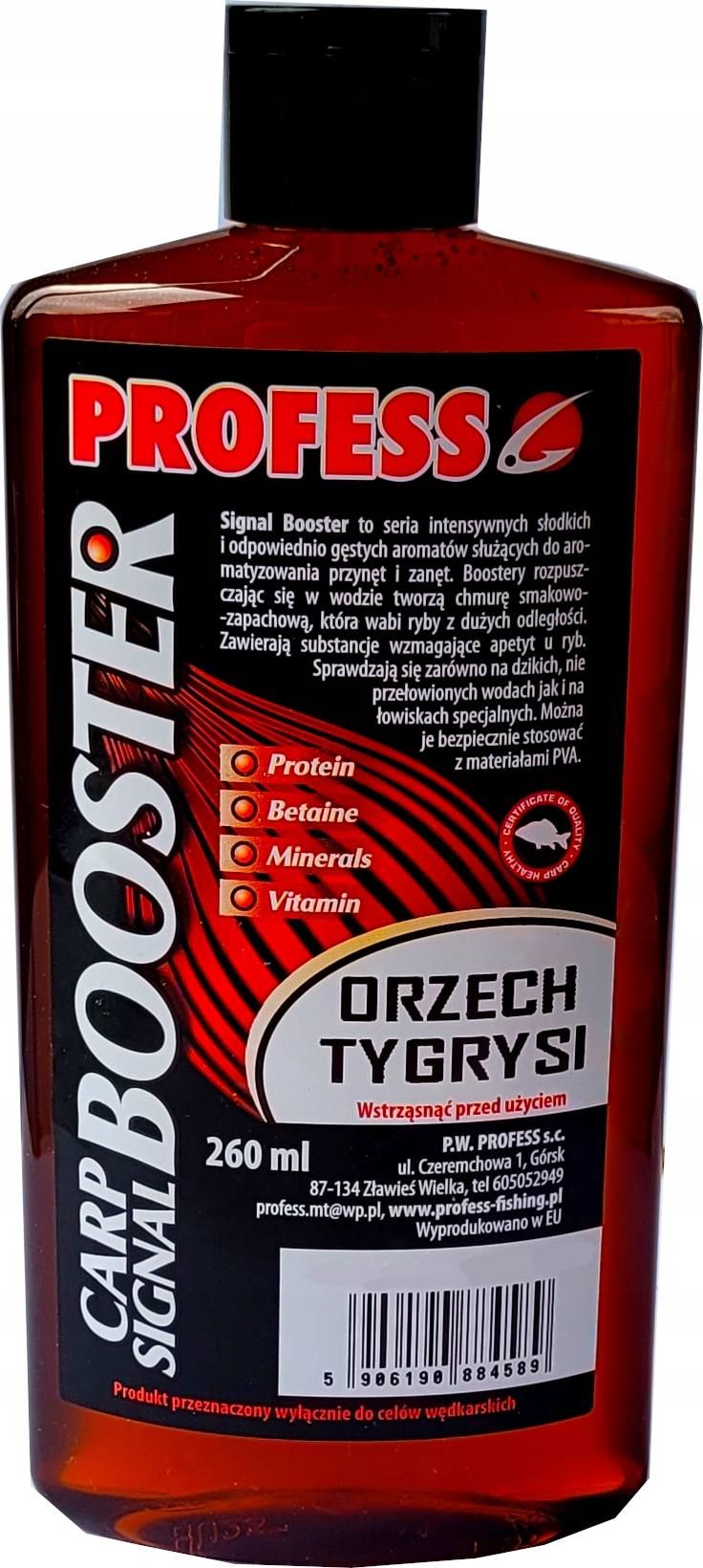 Profess Booster ORZECH TYGRYSI 260 ml. Booster w płynie firmy Profess. BOOSTER PROFESS – to seria słodkich intensywnych i gęstych aromatów służących do aromatyzowania, dosładzania przynęt i zanęt. Boostery rozpuszczając się w wodzie tworzą chmurę smakowo zapachową, która wabi ryby z dużych odległości. Boostery zawierają substancje wzmacniające apetyt u ryb. Można je bezpiecznie stosować z materiałami PVA. Służą do dopalania, wszelkich zanęt, sticków, nasion itp. Idealnie sprawdzi się również jako dip do kulek należy kulki pellety itp. zalać na minimum dobę przed wędkowaniem . Konfekcjonowany w opakowaniach 260ml. Cena za 1 opakowanie Booster Orzech tygrysi