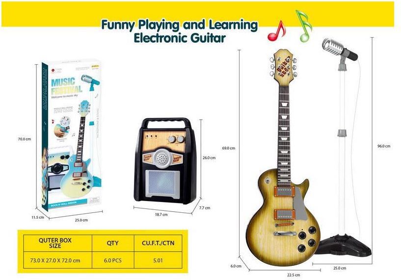 Opis Zestaw Gitara + Wzmacniacz Brąz Elektryczna gitara z wzmacniaczem oraz mikrofonem na stojaku, dla dzieci od 3 -go roku życia. Gitara posiada regulację głośności, różne rytmy oraz gotowe melodie. Zabawka zasilana jest bateriami typu 3 X AA 1,5 V (brak w zestawie). Wzmacniacz umożliwia podpięcie gitary, mikrofonu, można też podpiąć urządzenie z wgranymi melodiami MP3. Na wzmacniaczu, znajdują się pokrętła do regulacji głośności gitary oraz głosu w mikrofonie, w dolnej części mrugają w rytm melodii kolorowe światełka. Wzmacniacz zasilany jest bateriami typu 3 x AA 1,5 V (brak w zestawie). Stojak na mikrofon możemy regulować w górę i w dół. Funkcje zestawu odpowiednia dla dzieci od 3 -go roku życia, wyglądem przypomina prawdziwy instrument, ćwiczy palce, wyrabia poczucie rytmu, regulowany stojak na mikrofon, mikrofon z delikatnym nagłośnieniem, regulacja głośności, wybór rytmów, gotowe podkłady muzyczne. wzmacniacz z pokrętłami głośności mikrofonu i gitary oraz wejściem na gitarę, mikrofon i urządzenie MP3, mrugające światełka w rytm muzyki na wzmacniaczu. Wymiary gitara elektryczna ok. 69 cm x 23 cm x 5 cm, długość paska ok. 99 cm, stojak na mikrofon regulowana wysokość min. 57 cm, max 95 cm, podstawa ok. 24,5 cm x 22 cm, mikrofon ok. 17 cm x 4,5 cm x 5 cm, piec ok. 27 cm x 19 cm x 7,5 cm, opakowanie ok. 70,5 cm x 26 cm x 11,5 cm. Zawartość zestawu brązowa gitara elektryczna, stojak na mikrofon, mikrofon z nagłośnieniem, piec-wzmacniacz, pasek, kabel jack.
