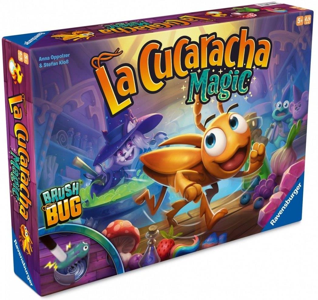 {col/50/} Ravensburger Gra Planszowa Zręcznościowa La Cucaracha Magic Liczba graczy: 2–4 osoby Wiek graczy: Od 5 lat Rodzaj: Gra zręcznościowa, rodzinna Zawartość zestawu: Karaluch BrushBug (z baterią) Plansza z 13 magicznymi kociołkami Czarodziejska różdżka 26 żetonów składników 20 żetonów mikstur …