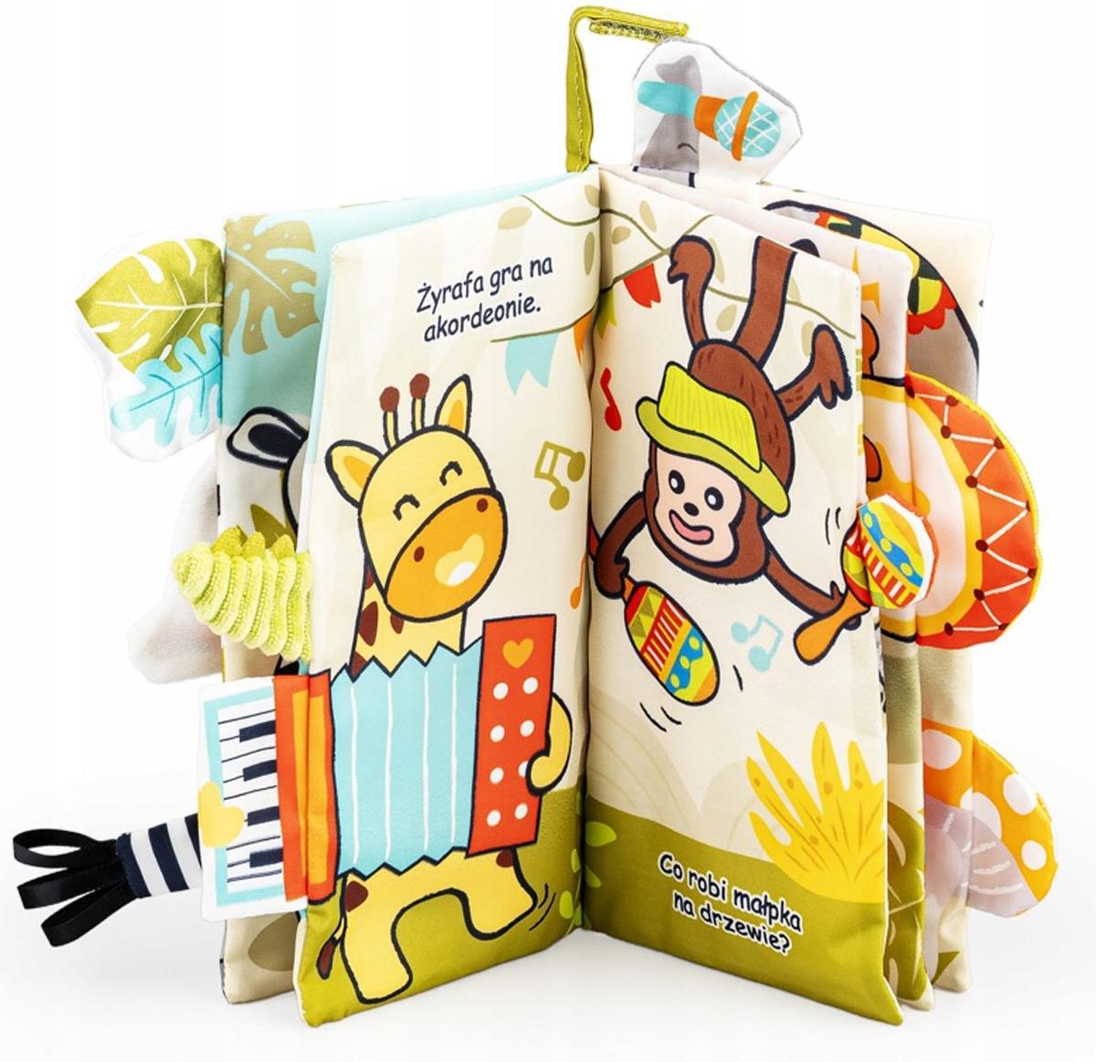 Książeczka Sensoryczna Orkiestra z Dżungli Szeleszcząca Jolly Baby 0m+ Jolly Baby – Książeczka „Orkiestra z Dżungli” z Ogonkami (0+) Muzykalne zwierzaki zapraszają do zabawy. Ta miękka, sensoryczna książeczka dla najmłodszych rozwija zmysły, zachęca do odkrywania faktur i dźwięków oraz wspiera rozwój już od pierwszych dni życia. Idealna do wózka, łóżeczka i małych rączek. CO TO ZA ZABAWKA? Miękka, edukacyjna książeczka sensoryczna Motyw: zwierzakowa orkiestra z dżungli Idealna dla dzieci 0+ Wystające ogonki i elementy dotykowe Lekka, bezpieczna, idealna do zabawy w domu i w podróży CO ZNAJDZIESZ W ŚRODKU? Szeleszcząca okładka Obrotowa papuga – można odpiąć i bawić się osobno Kolorowe, kontrastowe ilustracje zwierząt Różnorodne faktury materiałów Wystające „ogony” i detale do chwytania Piszczałka i szeleszczące elementy Krótkie zdania w języku polskim na każdej stronie DODATKOWE FUNKCJE Zawieszka na rzep – idealna do wózka, łóżeczka, fotelika Zachęca do chwytania, ściskania i manipulacji Stymuluje słuch, wzrok i dotyk Wspiera rozwój motoryczny i poznawczy WALORY EDUKACYJNE Rozwój sensoryczny od pierwszych dni Nauka prostych skojarzeń i dźwięków Ćwiczenie małej motoryki i koordynacji Pobudzanie ciekawości i eksploracji INFORMACJE Wiek: 0+ Producent: Jolly Baby