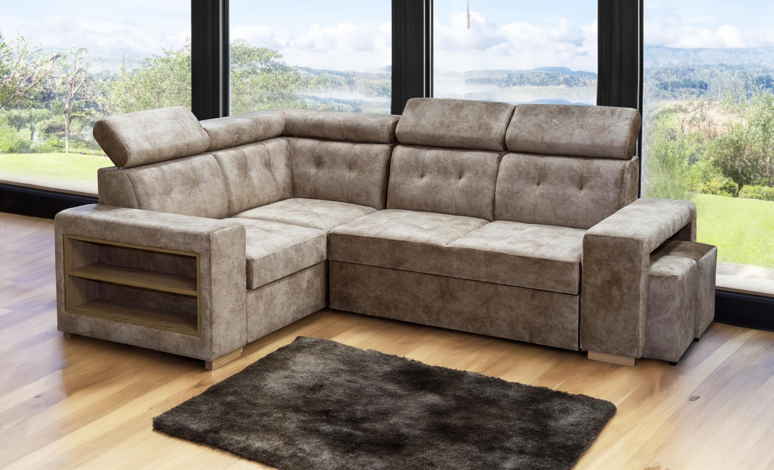 Narożnik do salonu 270/210 cm Leon z pufami i półkami, funkcja spania półki funkcja spania regulowane zagłówki pufy chowane w boczku ZDJĘCIE PRZEDSTAWIA REALNY WYGLĄD PRODUKTU. NIE JEST WIZUALIZACJĄ KOMPUTEROWĄ. Wygodny narożnik z praktycznymi dodatkami Narożnik Leon o wymiarach 270x210cm został zaprojektowany w minimalistycznym stylu, idealnie wpisując w każde wnętrze. Wyposażony został w szereg funkcji między innymi: regulowane zagłówki, drewniane półki w boczku oraz chowane pufy.Ponadto wypoczynek posiada funkcję spania, która w razie potrzeby zmienia się w wygodne miejsce do spania o wymiarach i 130×190 cm. Oryginalny design i funkcjonalność Staranne wykonanie oraz zastosowanie materiałów najwyższej jakości gwarantuje wieloletnią satysfakcję z użytkowania. Siedziska wykonane są w systemie sprężyn falistych typu B pokrytych wysoko elastyczną pianką tapicerską. Większość firm zamiast tego oferuje płytę meblową i piankę, nie stosując sprężyn, co w rezultacie sprawia, że takie miejsce nie nadaje się do codziennego spania. Wymiary: Narożnik Leon: 270 x 210 cm powierzchnia spania: 130 x 190 cm Narożnik Leon dostępny prawo lub lewostronny. Realizuję również meble na indywidualne zamówienie (wymiary, strony, szycia, wzory, układy, wybarwienia listew wykończeniowych itp.). Posiadamy szeroki wybór tkanin w trzech wersjach cenowych: Tkaniny z grupy I – podstawowej Tkaniny z grupy II – z dopłata 10% od ceny podstawowej Tkaniny PREMIUM – z dopłatą 25 % od ceny podstawowej Oraz wysokiej jakości ekoskóry. Dysponujemy tkaninami plamoodpornymi łatwo czyszczącymi firmy Fargotex i wielu innych producentów.SZEROKI WYBÓR TKANIN I KOLORÓW EKOSKÓRY I WYBARWIENIA DREWNA, ZNAJDUJĄ SIĘ NA STRONACH PONIŻEJ:TKANINY OBICIOWEWYBARWIENIA DREWNASKÓRY SYNTETYCZNEPracujemy wyłącznie na sprawdzonych produktach polskich i zagranicznych producentów (nie korzystamy z wschodnich podróbek). Naszym priorytetem jest dokonanie wszelkich starań, aby Nasi klienci byli zadowoleni.Meble wykonane są z wysokiej jakości polskich materiałów.Aby uzyskać więcej informacji, proszę o kontakt z naszymi sprzedawcami: Tel: 788 509 803Tel: 661 442 118 Istnieje możliwość obejrzenia oferowanych przez naszą firmę mebli przez 6 dni w tygodniu. Od poniedziałku do piątku w godzinach 8:00-17:00 oraz w sobotę od godziny 8:00 do 12:00 w siedzibie naszej firmy. UWAGA !!! WNOSZENIE TOWARU W ZAKRESIE KLIENTA ! MEBLE MIESZCZĄ SIĘ W DRZWIACH 80 CMCzas realizacji zamówienia od 3 do 6 tygodni. Możliwy szybszy czas realizacji, jeśli dany model znajduje się na stanie magazynowym..
