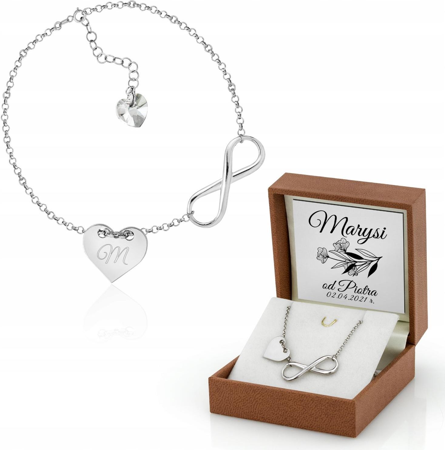 Parametry Bransoletka materiał: srebro próba: 925 wykończenie: rodowanie kamień: kryształ SWAROVSKI wymiary nieskończoności: 2,5 cm wymiary serca: 1,5 cm waga: 2,8 g długość: 17 cm bransoletki + 3 cm przedłużenia na serduszku wykonamy grawer techniką diamentową Pudełko wymiary: 7 x 7 x 3,2 cm materiał: ekoskóra kolor zewnętrzny: brązowy wykończenie wewnątrz: biała, welurowa poduszeczka, z subtelnymi wcięciami do założenia biżuterii dedykacja na tabliczce Personalizacja Aby w pełni spersonalizować produkt, prosimy o przesłanie potrzebnych danych na adres email, a nasi graficy zajmą się resztą :)