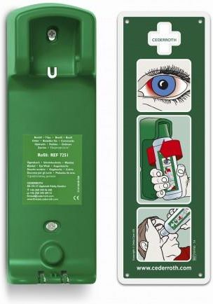 Uchwyt ścienny na płuczki do oczu Cederroth REF 7200 to solidne i praktyczne rozwiązanie do przechowywania płukanek Cederroth o pojemności 500 ml. Płukanki umieszczamy w uchwytach i wieszamy na ścianie w punktach pierwszej pomocy lub innych wyznaczonych lokalizacjach. Uchwyt zapewnia bezpieczne umieszczenie i przechowywanie butelki z płukanką w doskonale widocznym miejscu. Butelka pozostaje zatrzaśnięta w uchwycie, a wyjęcie jej z niego powoduje automatyczne otwarcie - natychmiast można rozpocząć płukanie oka. Cechy produktu: eksponuje płukanki w wyznaczonych miejscach przez co są one szybko dostępne w sytuacjach zagrożenia, butelka po uwolnieniu z uchwytu jest otwarta i gotowa do użycia (korek pozostaje w uchwycie), solidna jakość wykonania gwarantuje długą trwałość uchwytu, uchwyt ścienny dostępny jest z fluoroscencyjną tabliczką informacyjną - instrukcją używania płuczki do oczu, zaleca się umieszczenie dwóch uchwytów ściennych obok siebie. W czasie wypadku może dojść do urazu obojga oczu. Pasuje do: Płuczka do oczu Cederroth Eye Wash 2 x 500ml dwupak REF 725200 Płuczka do oczu Cederroth Eye Wash 1 x 500 ml REF 7251 Parametry techniczne: wymiary: 9 x 27 x 7 cm, waga: 176 g, zbudowany z: Poliamidu, włókna szklanego oraz PVC.