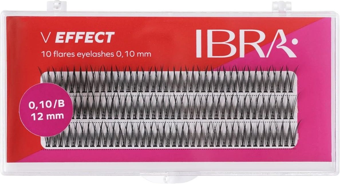 Ibra Kępki rzęs V effect 0,10 B 12mm Ibra Profesjonalne kępki ułożone w charakterystycznym kształcie litery „V” długość rzęsek zmniejsza się stopniowo od zewnętrznych stron do środka kępki, przez co nadają bardzo nowoczesny efekt znany jako "Fish Tail" oraz "Jaskółki". Przeniosą Twój makijaż w zupełnie nowy wymiar. Uzyskaj modny unikatowy look inspirowany makijażami gwiazd. Zalety kępek "V effect" marki IBRA Makeup: idealne do delikatnych stylizacji, dostępne w różnych długościach, idealne do makijażu dla osób, które wolą subtelniejszy efekt.