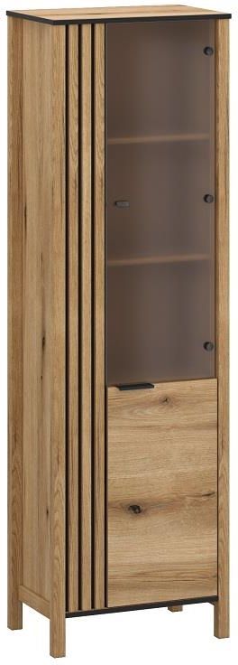 Witryna dwudrzwiowa prawa HELIX 1d1w firmy MEBELBOS Połączenie ozdobnych ryfli z dekorem dębu evok nadaje witrynie HELIX nowoczesnego, a zarazem atrakcyjnego wyglądu. Ładnego akcentu dodają także czarne, subtelne uchwyty. Witryna HELIX wyposażona została w 3 półki, schowane za eleganckimi …