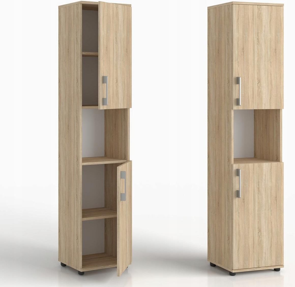 Regał biurowy do salonu, pracowni, sypialni na segregatory i książki Szafa biurowa z półką otwartą M 2D dąb sonoma 40 x 40 cm Regał na segregatory i książki to doskonałe rozwiązanie do biur lub pomieszczeń domowych. Klasyczny wygląd i funkcjonalność spełnią oczekiwania najbardziej wybrednych klientów. Informacje dodatkowe klasyczne wzornictwo pięć wytrzymałych półek dopasowany do segregatorów biurowych podwyższona odporność na zarysowania nóżki w kolorze czarnym 3 cm korpus i front w kolorze dąb sonoma dostępne inne wersje regału M Regał do samodzielnego montażu z czytelną instrukcją. Wymiary regału szerokość 40 cm wysokość 182 cm głębokość 40 cm odległość miedzy półkami 33 cm Wnętrze regału. Regał wyposażono w półkę otwartą oraz dwoje drzwiczek, za którymi znajdują się cztery półki. Materiał. Korpus oraz front wykonano z płyty laminowanej producenta Kronopol o grubości 16 mm w kolorze dąb sonoma. Plecy zrobiono z płyty HDF 3 mm. Obrzeża. Krawędzie płyty są oklejone PCV odpornym na wilgoć i zarysowania.