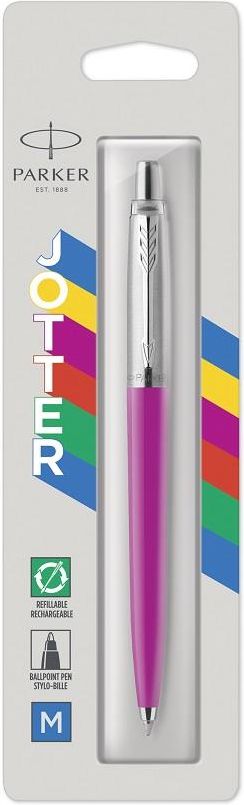 Jeden z najbardziej charakterystycznych oraz najbardziej rozpoznawalnych produktów marki Parker, czyli długopis Parker Jotter. Posiada różowy kolor, sprawiający, że jest to długopis łatwo zapamiętywany i z pewnością wyróżniający się na tle innych. Ciekawa kolorystyka to jednak nie jedyny atut długopisu Parker Jotter różowy.Ten model wykonano ze szczotkowanej stali i żywicy. Posiada oryginalny i bardzo charakterystyczny klip i pierścień z logo marki. Elementy te wykonano w gustownym srebrnym kolorze. Długopis Parker Jotter jest popularny zarówno z uwagi na bardzo ciekawy design, ale i fantastyczną jakość. Ten popularny produkt piśmienniczy to gwarancja najlepszego wykonania oraz stuprocentowej staranności w wykonaniu każdego elementu składowego. Równocześnie jest znakomicie wyważony i komfortowy w pisaniu.Długopis Parker wyposażono w przyciskowy mechanizm wysuwania wkładu. Posiada dość ekstrawagancki, kobiecy kolor lakieru oraz stonowane, srebrne wykończenia.