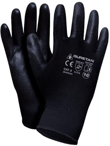 Rękawice ochronne wykonane z elastycznej dzianiny poliestrowej (ścieg 13, 100% poliester), w kolorze czarnym. Powlekane czarnym poliuretanem w części chwytnej. Zapewniają chwytność oraz dobre czucie trzymanego przedmiotu. ZASTOSOWANIE: Stosowane do precyzyjnych prac, idealne dla elektryków. Stosowane w przemyśle elektrotechnicznym, w tym: elektryka i elektronika oraz energetyka. Używane w przemyśle samochodowym, w tym: budowa, mechanika i naprawa pojazdów oraz lakiernictwo. ROZMIARY: 7,8,9,10,11 SPOSÓB PAKOWANIA: Pakowane po 12 par w worek foliowy, 240 par w kartonie. NORMY I CERTYFIKATY: Spełniane normy: CE CAT. II. EN388 3131X