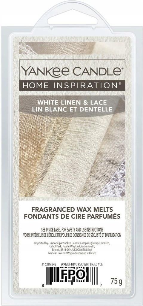 Yankee Candle Wosk White Linen & Lace Czysty, elegancki i subtelnie kwiatowy - Yankee Candle White Linen & Lace to zapach, który przywodzi na myśl świeżo upraną, delikatną bieliznę suszącą się w ciepłym, wiosennym powietrzu. Nuty głowy otwierają kompozycję rześkim ozonem, słodką maliną i kwiatem jabłoni. W sercu rozwijają się pudrowe tony irysa, konwalii, jaśminu i ylang-ylang, otulając zmysły łagodną kwiatową aurą. Baza z jedwabiu, drzewa sandałowego, cedru i piżma nadaje zapachowi głębię i wyjątkową miękkość. To doskonały wybór do wnętrz, w których chcesz podkreślić świeżość, lekkość i spokój. Sprawdzi się świetnie w sypialni, łazience i przestrzeniach do wypoczynku. Dlaczego warto wybrać Wosk Yankee Candle White Linen & Lace subtelny zapach świeżego prania i kwiatowej elegancji, szybko uwalniający się, intensywny aromat o kojącym charakterze, idealny do codziennego użytku, szczególnie w pomieszczeniach relaksacyjnych, wygodna forma wosku - świetna do testowania i łączenia zapachów. Sposób użycia Umieść kawałek wosku w górnej części kominka zapachowego (tradycyjnego lub elektrycznego). W trakcie podgrzewania wosk zacznie się topić, uwalniając zapach. Nie dodawaj wody. Po zastygnięciu wosk możesz ponownie użyć lub łatwo go wymienić na inny aromat. Pojemność: 75g