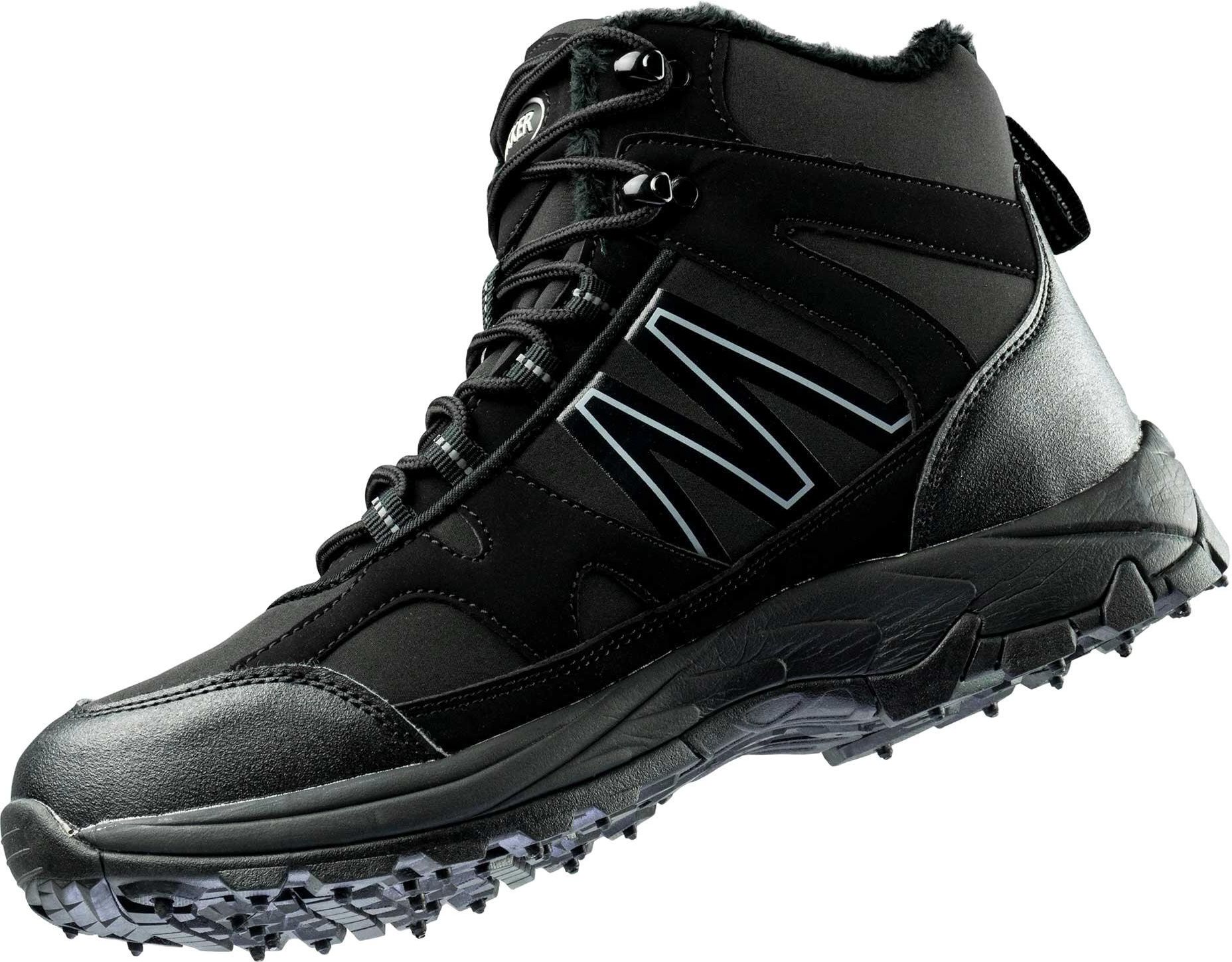Wysokie buty z podszewką z ciepłego futra to niezawodny wybór na oblodzone i zaśnieżone spacery lub leśne wycieczki. Kolce i bogata struktura 15 stalowych kołków podstawy zapewniają dobrą przyczepność nawet w śliskich warunkach. Buty wykonane są z materiału softshell, trwałego, oddychającego materiału, który odpycha zarówno wiatr, jak i wodę. Buty mają miękką i ciepłą futrzaną podszewkę od wewnątrz, aby utrzymać stopy w cieple nawet w chłodne dni. Informacje o produkcie: - Kolor: czarny - Rozmiary: 41 - 46 (EU) - Materiał: Softshell - Stalowe kołki: 15 szt. - Wodoodporna powierzchnia - Miękka i ciepła futrzana podszewka - Szeroka cholewka