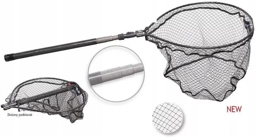 Węglowa rama i węglowa sztyca. Bardzo praktyczny w transporcie podbierak przeznaczony do podbierania dużych ryb. Dzięki możliwości składania, jest łatwy do przenoszenia i rozkładania. Teleskopowa sztyca pozwala na podbieranie ryb z dalszej odległości. Węglowa rama i sztyca sprawiają, że ten duży gabarytowo podbierak jest lekki.