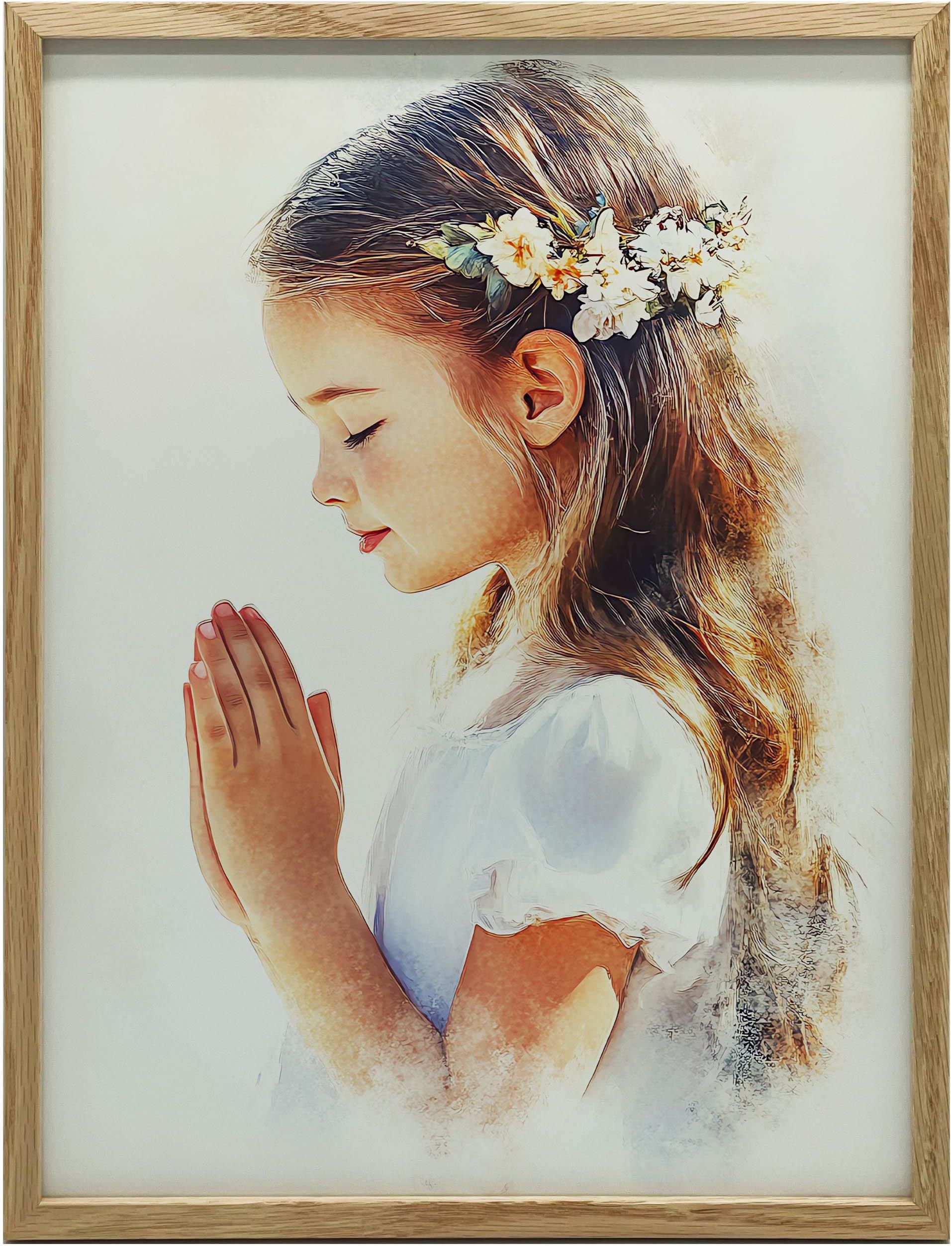 Obrazek przedstawiający modlącą się dziewczynkę w stroju komunijnym z wiankiem na głowie to wyjątkowa pamiątka Pierwszej Komunii Świętej, która doskonale oddaje duchowy aspekt tego sakramentu. Wykonany w technice akwareli, obraz ukazuje piękno i głębię modlitwy, będąc symbolicznym elementem obchodów tego wyjątkowego dnia. To idealna pamiątka dla dziewczynki, która po raz pierwszy przystępuje do Eucharystii. Może być doskonałym prezentem komunijnym od matki chrzestnej, ojca chrzestnego lub innych bliskich. Obrazek będzie miłym przypomnieniem o Pierwszej Komunii Świętej przez wiele lat. Stanowi sentymentalny upominek, który doda uroku każdemu wnętrzu, tworząc wyjątkową atmosferę wspomnień z tego szczególnego dnia.