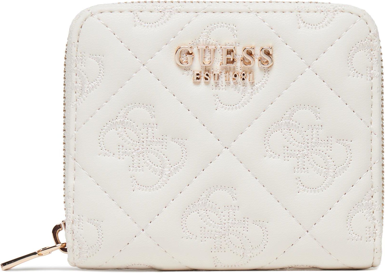 Biały damski portfel ze skóry ekologicznej marki Guess. Zamykany na zamek, wewnątrz zamykana kieszeń na bilon, jedna przegroda i 4 miejsca na karty.
