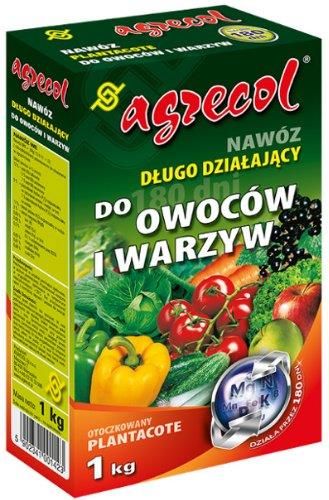 PLANTACOTE NAWÓZ DO OWOCÓW I WARZYW - 1 kg nawóz służy do odżywiania warzyw oraz drzew i krzewów owocowych zapewnia wysoki i zdrowy plon składniki mineralne dostępne są dla roślin przez 5-6 miesięcy nawóz sprawdza się w momentach zwiększonego zapotrzebowania roślin na składniki pokarmowe Plantacote nawóz do owoców i warzyw to nowoczesny, kompletny nawóz otoczkowany o długotrwałym działaniu, przeznaczony do nawożenia w uprawach roślin warzywnych i sadowniczych. W pełni odżywione owoce i warzywa są pełne witamin i składników odżywczych. Prawidłowo nawożone drzewa i krzewy są zdrowe i odporne na stresowe warunki środowiska, np. suszę, patogeny. Dzięki temu są w stanie wytworzyć liczne plony doskonałej jakości. Plantacote nawóz do warzyw i owoców nie powoduje gromadzenia się azotanów w owocach. Otoczkowane granule zapobiegają wypłukiwaniu nawozu do głębszych warstw podłoża, niedostępnych dla korzeni roślin. W ten sposób więcej składników odżywczych jest wykorzystywanych przez rośliny (aż do 80-90%). Stosowanie nawozu otoczkowanego niweluje ryzyko przenawożenia, a przy tym chroni środowisko naturalne. Plantacote to kompletny, wieloskładnikowy nawóz o działaniu determinowanym przez czynniki środowiska, tj. wilgotność i temperaturę otoczenia. To najdłużej uwalniający składniki pokarmowe nawóz w ofercie Agrecol. Dzięki zastosowaniu specjalnej technologii otoczkowania zabieg nawożenia można wykonywać jedynie raz w sezonie wegetacyjnym. Sposób stosowania Stosować 1 raz w roku na początku sezonu wegetacyjnego wiosną (marzec, kwiecień lub maj). Nawóz można stosować również podczas sadzenia. DRZEWA I KRZEWY OWOCOWE. Nawozić rozsypując nawóz pod koronami drzewek lub krzewów. Po rozsypaniu nawóz wymieszać z wierzchnią warstwą gleby i obficie podlać wodą. Drzewa i krzewy owocowe nawozić w dawce 50 g nawozu na 1 m wysokości rośliny. WARZYWA. Nawozić rozsypując nawóz wokół roślin. Po rozsypaniu nawozu w miarę możliwości nawóz wymieszać z wierzchnią warstwą gleby. Warzywa nawozić w dawce 50 g nawozu na 1 m2 powierzchni upraw. Jedna garść to około 40 – 50 g granulatu.