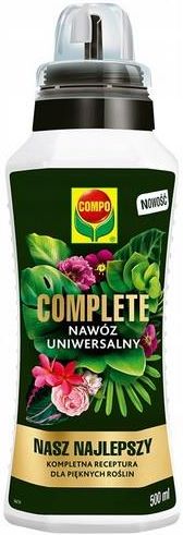 COMPO COMPLETE Nawóz uniwersalny Najlepszy nawóz do wszystkich roślin domowych, balkonowych i tarasowych, Posiada bogatą recepturę dla pięknych roślin, Zapewnia zdrowy wzrost i obfite kwitnienie, Idealny wybór dla Twoich roślin domowych, balkonowych oraz tarasowych. Producent zaleca Przed użyciem, wstrząsnąć. Odmierzyć za pomocą nakrętki odpowiednią ilość nawozu, ułatwieniem są zaznaczone trzy poziomy na nakrętce: Poziom I - 2 litry wody Poziom II - 4 litry wody Poziom III - 6 litry wody Cała nakrętka na 10 litrów wody. COMPO COMPLETE to najlepszy nawóz specjalnie opracowany do odżywiania wszystkich roślin domowych, balkonowych i tarasowych. Kompletna receptura zawierająca w swoim składzie makro- i mikroskładniki pokarmowe sprawia, że jest to idealny wybór dla Twoich roślin. Certyfikowane surowce i bogaty skład zapewniają stabilny rozwój, wzmacniają odporność na choroby oraz pozytywnie wpływają na kondycję roślin. Nawóz COMPLETE posiada wszystkie niezbędne składniki gwarantujące piękne i obficie kwitnące rośliny. Nawóz jest niezwykle wydajny, a butelka 500 ml wystarcza na przygotowanie aż 150 l roztworu do podlewania. Instrukcje dotyczące stosowania: do całorocznego nawożenia wszystkich roślin domowych i balkonowych, w dawce 7 ml na 1 L wody. Terminy stosowania umieszczone z tyłu opakowania.